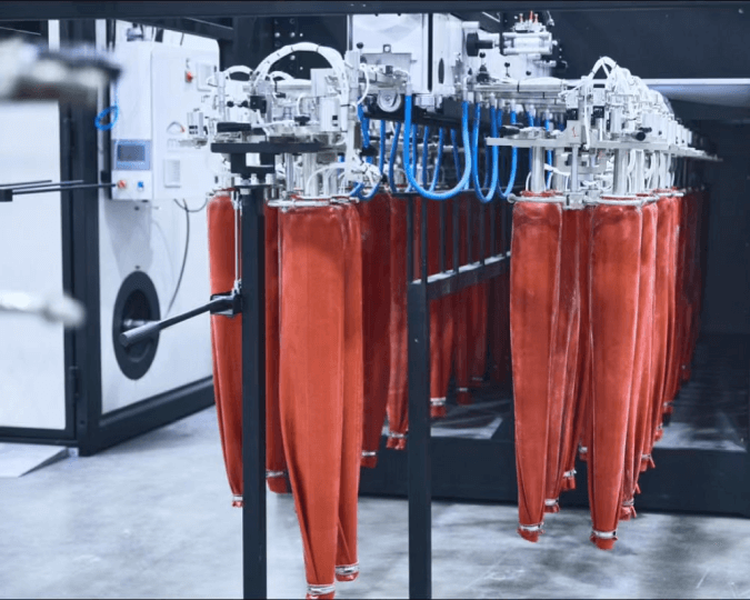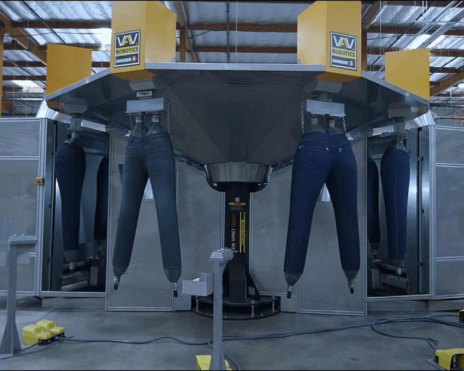 Robotic arms controlled by a proprietary software carefully and automatically sprays each pair of jeans without any mistakes. The process is cleaner than traditional denim spraying because the factory doesn’t use any permanganate.